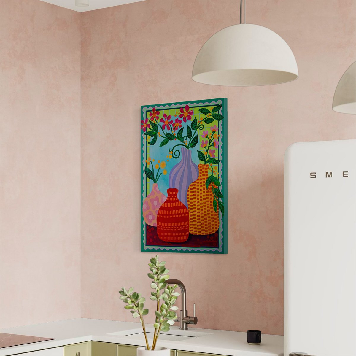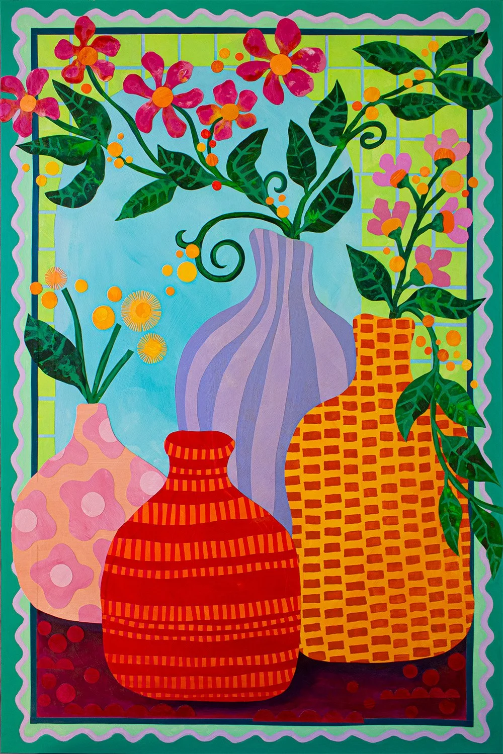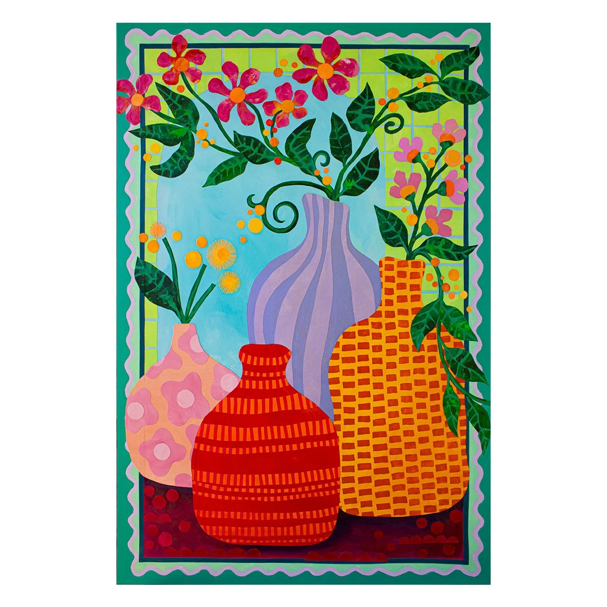 The vivid palette of pinks, yellows, greens, and violets brings a sense of optimism and renewal. It’s lively yet serene, joyful yet balanced, a painting that hums with gratitude for simple things.